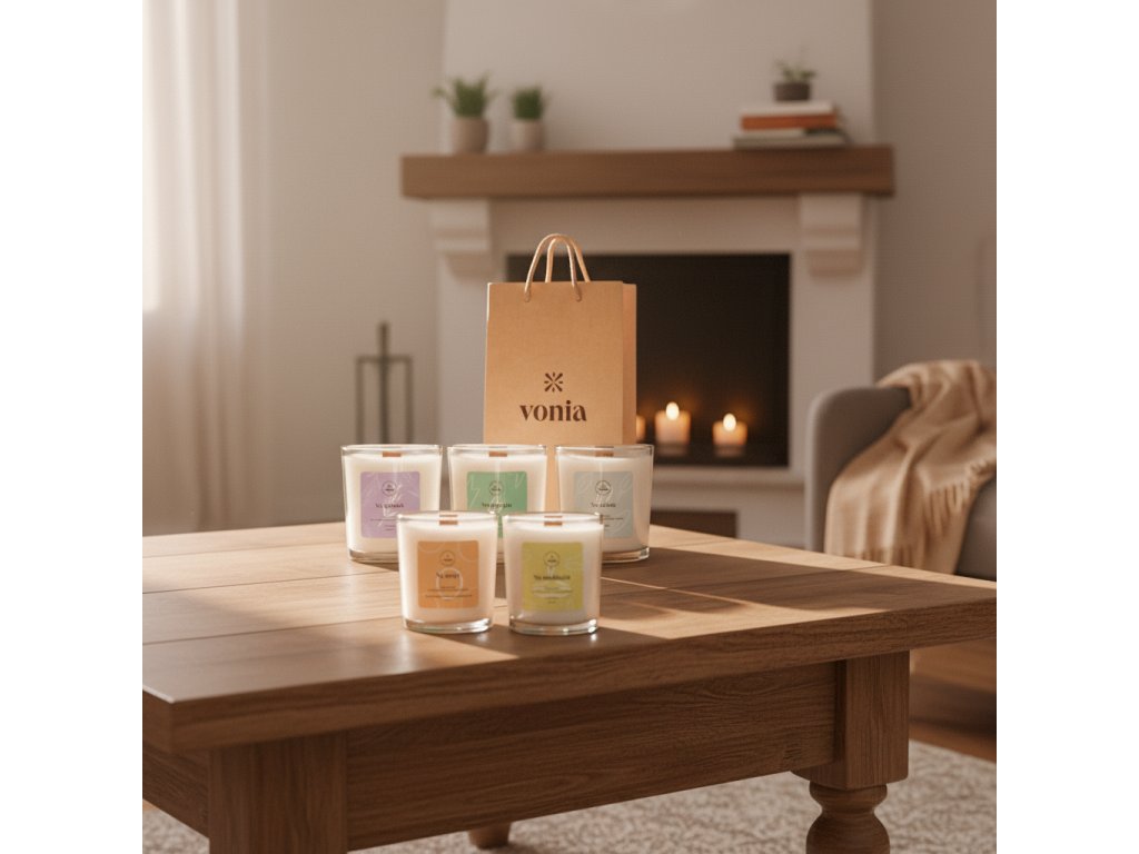 Objavte jedinečný darčekový set, ktorý spája päť luxusných sójových sviečok a elegantnú darčekovú tašku z prírodného hnedého papiera. Tento set je ideálnym darčekom pre každého, kto túži po relaxácii, obnove energie alebo vnútornom pokoji.