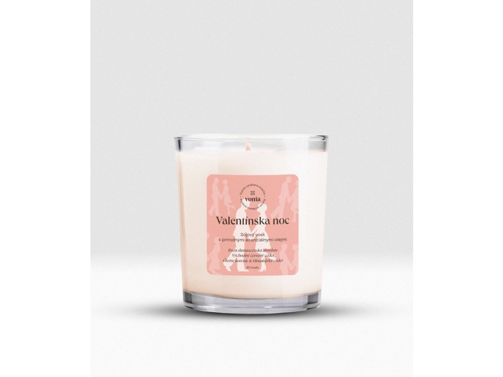 Limitovaná edícia dekoratívnej, unikátnej ručne robenej sójovej sviečky Valentínska noc s bavlneným knôtom posypaná sušenými ružami. Bola navrhnutá ako vôňa hlbokej intimity, vášne a jedinečných momentov. Jej jedinečnosťou je vzácny esenciálny olej ruže damascénskej absolute, ktorý patrí k technologicky najnáročnejším na získanie, preto sviečky s jej obsahom patria medzi klenoty vo svete sviečok.